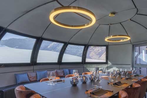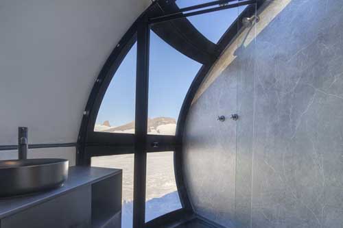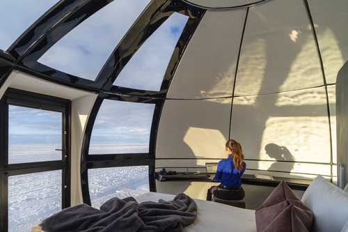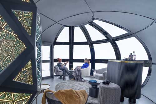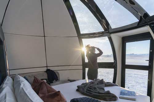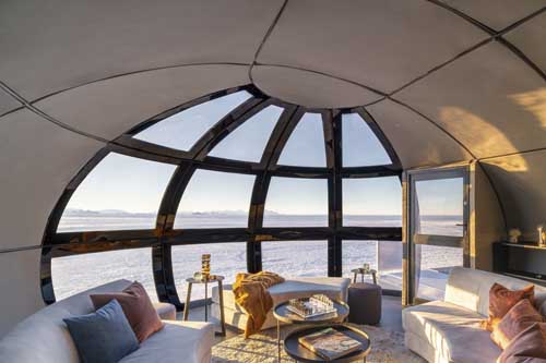 El campamento: Este elegante y moderno campamento ecológico cuenta con una área de estancia común y un comedor. El diseño de estas cápsulas, más conocidas como ‘Sky Pods’ los hace parecer como si hubieran sido transportados desde Marte. Los detalles futuristas se presentan en la cúpula del cielo, emulando los interiores de las estaciones espaciales. Cada cápsula está climatizada y cuenta con ventanas que permiten a los huéspedes disfrutar de las vistas.